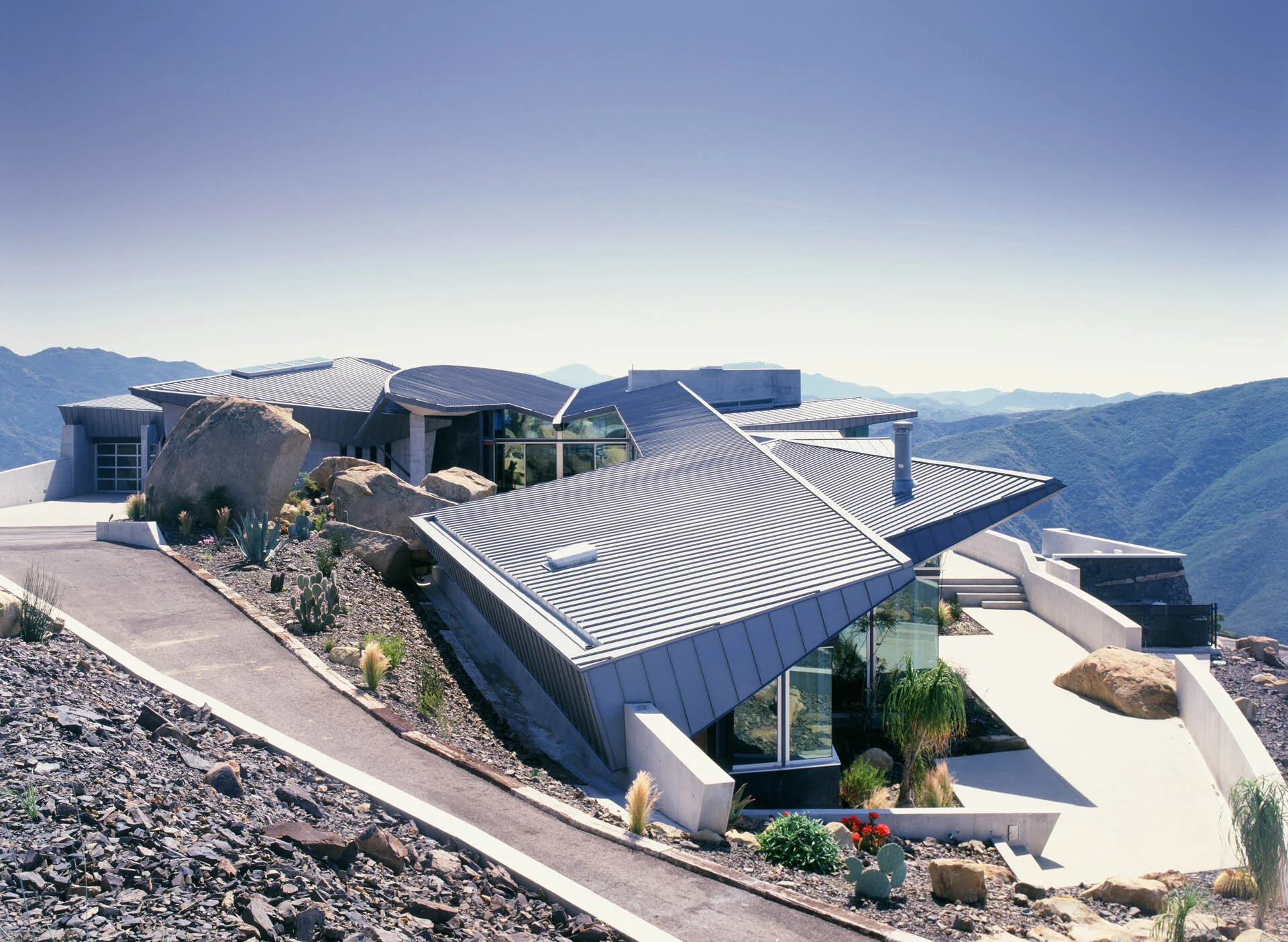 The owners’ fascination with racing automobiles is expressed through formal gestures evoking motion. Exposed steel moment framing, expansive glass panels and 12 feet long x 8-inch thick concrete cantilevers speak of high technology. In addition, a “butterfly” roof is directed south and angled at 32 degrees to achieve maximum solar collection; it also collects and channels water for site irrigation. Trombe exterior walls of formed concrete and an “air floor” created by honeycombed double concrete slabs provide enough thermal massing to allow for 67% of the interior space to be glazed. Cantilevered concrete and glass curtain walls angle at 8 degrees towards significant sight lines, axes and over Mullholand Canyon.