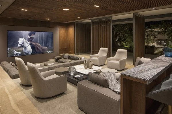 Previously, a sudden and steep grade change from the main house justified a basement walkout in the guest house that led to a tennis court. We removed the latter and dropped the elevation six feet to add significant interior space with a green lawn overhead. Similar to the main house, the two-story guest house benefits from increased glazing and a more efficient layout which now includes a spa, gym, hair salon, a new lounge, and a showcase garage.