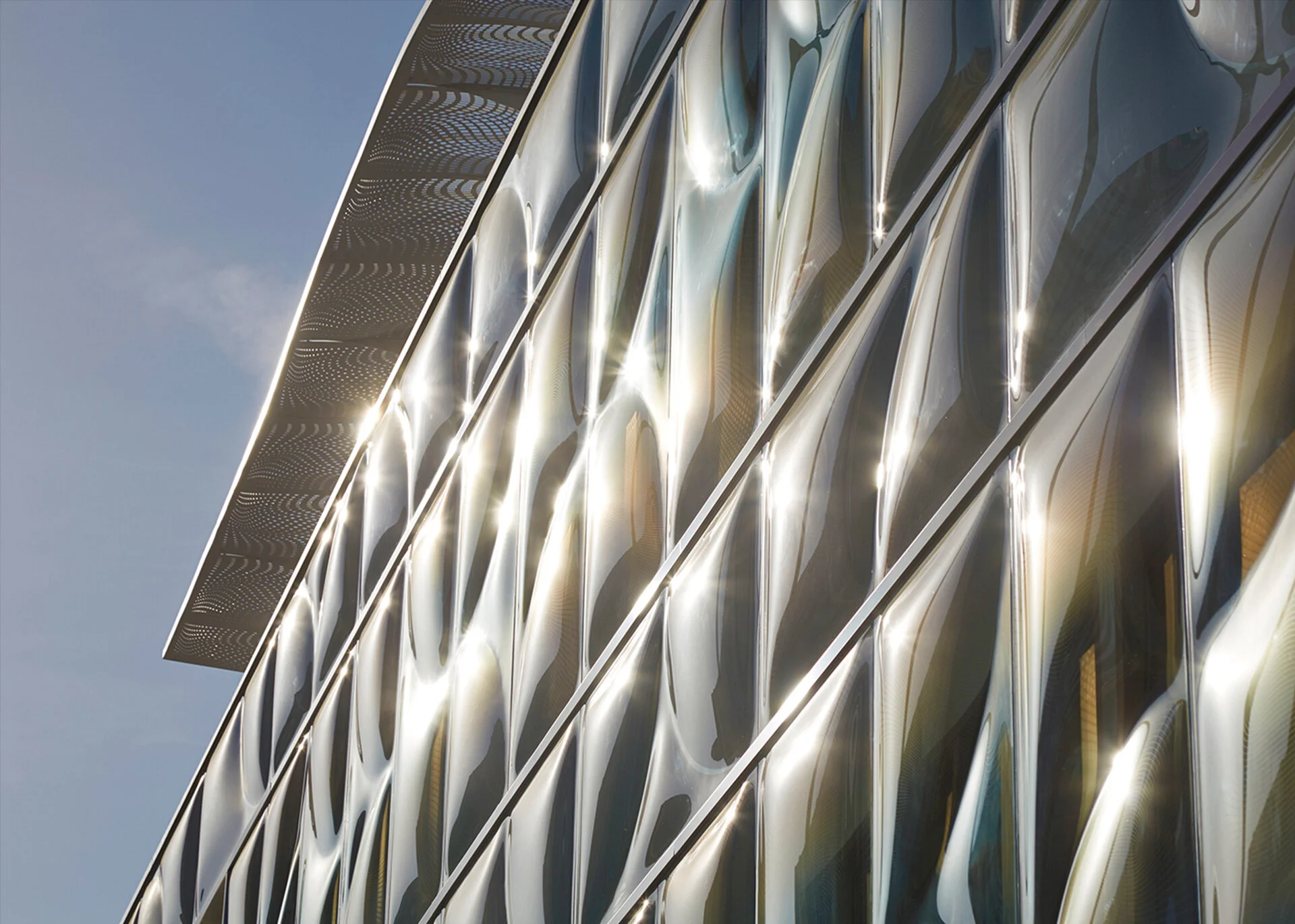 The third material shapes the roof line / profile of the facade. The light “spiderweb-like” laminate interlayer of the slumped glass is abstracted and expanded upon to create custom perforated metal panels for the roof canopy. This application gives the façade unified undulating shape while also providing a finer grained texture that dapples ground with a varying array of shadows. This seamless transition of pattern across materials creates a unique, seemingly kinetic building that contributes to its surrounding urban fabric and the casual onlooker alike.