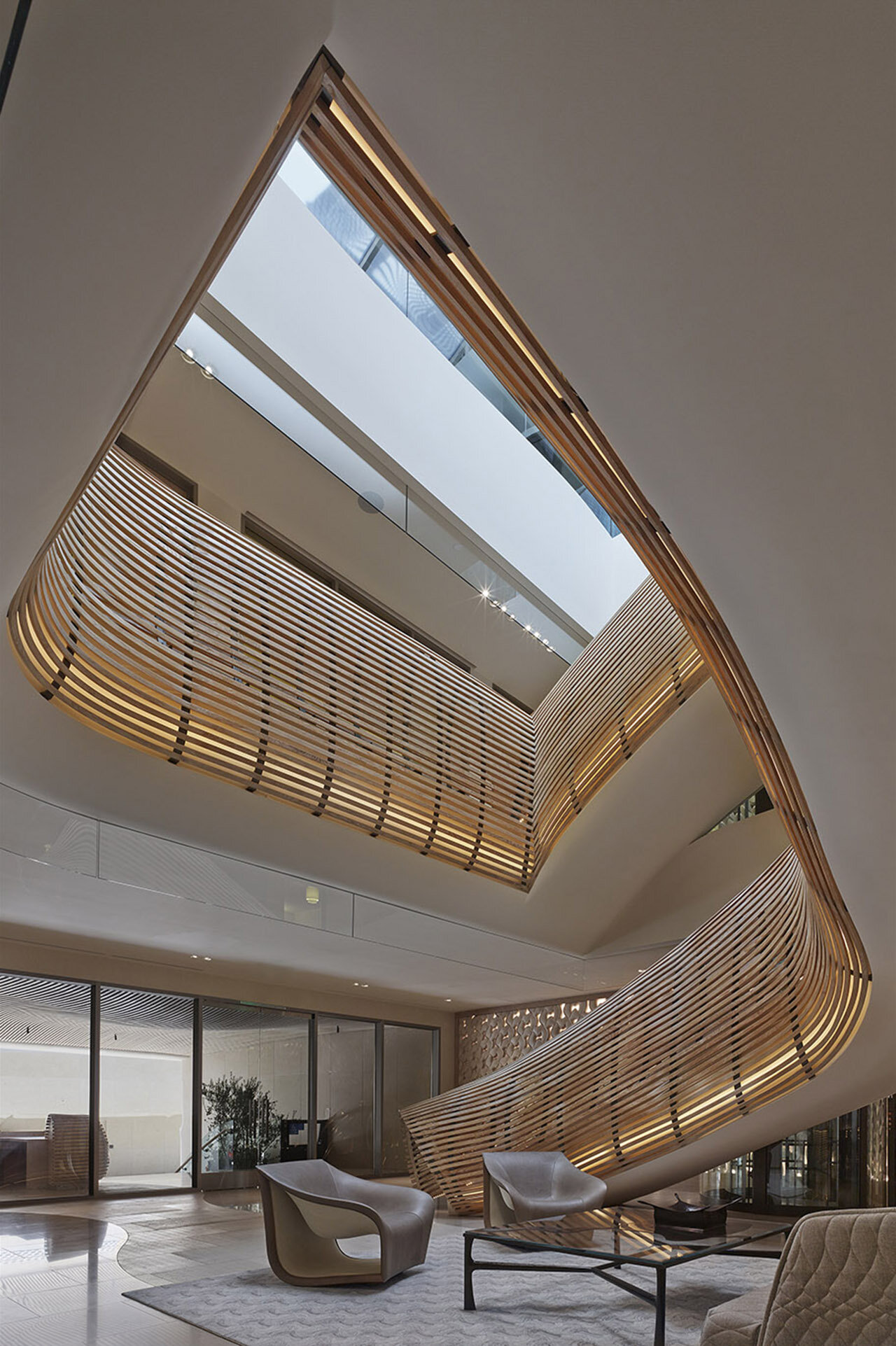 Beyond the formal and conceptual aspects of the glass façade system and general layout strategy are the performative qualities of both. The double layer façade system, made from custom slumped glass, helps to regulate indoor air quality in a seasonal fashion by mechanically venting hot air up and out in the summer and heating and circulating the cooler air in the winter. Opening up the atrium space mirrors this chimney effect from the façade by utilizing an operable skylight to release or retain heat depending on the conditions. Furthermore, the customized pattern interlayer sandwiched within the glass panels selectively filters views, privacy, and light based on specific site conditions and client needs.